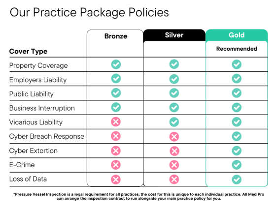 As shown below, only the Gold Package includes all nine essential cover types. If your practice handles sensitive patient data, employs associates, or simply wants to avoid costly disruptions, the Gold Package is the clear choice.